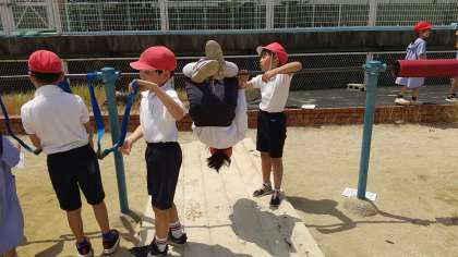 休み時間に鉄棒をしたり、体育科の時間に取り組んだりしています。