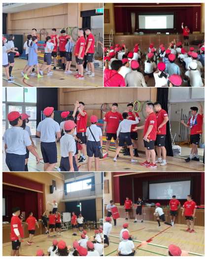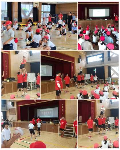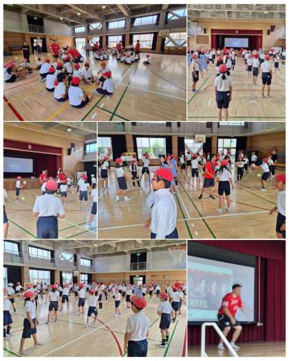 あいさつ運動などで関わっていただいている「レッドハリケーンズ」のみなさんに夢についてのお話と、簡単なラグビー体験をしました。