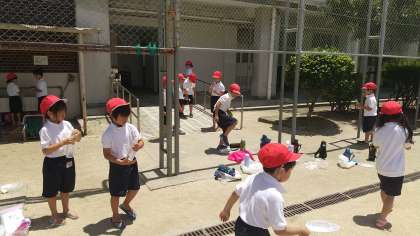 プラ容器に水を入れてとばしたり、ストローやうちわの骨組みを利用してシャボン玉をつくったりしました。