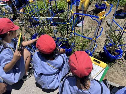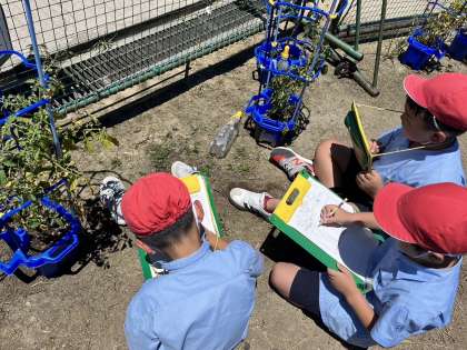 5月から観察を続けてきたトマトも実がなり、赤く色付くのを楽しみにしています。学習園で育てた野菜も大きく育ちました。野菜を育てることで、成長することの喜びを感じています。