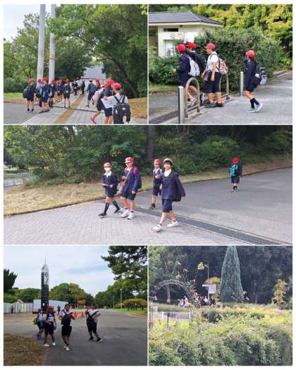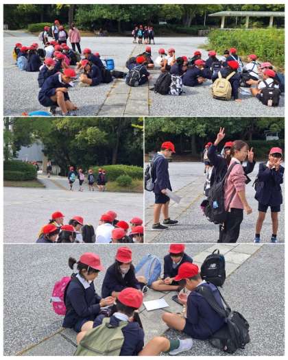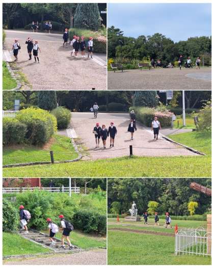 今、服部緑地公園内でグループになってオリエンテーリングの真っ最中です。時間をあわせてゴールを目指します。