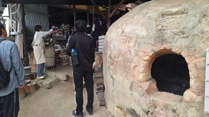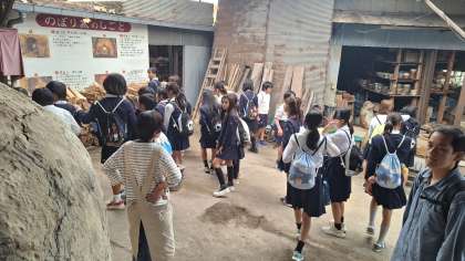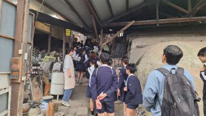 宗陶苑でクラス写真、のぼり窯の見学をしてバスに乗車です。