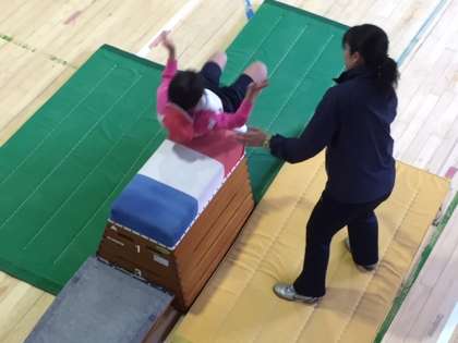 台上前転や開脚とびの練習をしています。