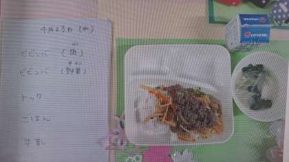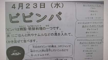 23日の給食は、ビビンバ、トック、ごはんでした。