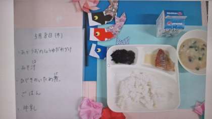 今日の給食の献立は、あかうおのしょうゆだれかけ、みそ汁
