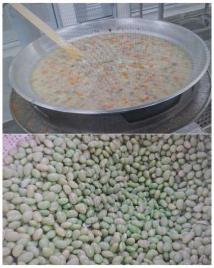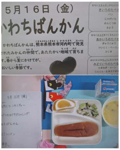 今日の給食は、鶏肉とコーンのシチュー、キャベツのひじき