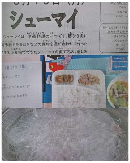 本日の献立は、焼きシューマイ、鶏肉と春雨のスープ ツナともやしの炒め物でした。