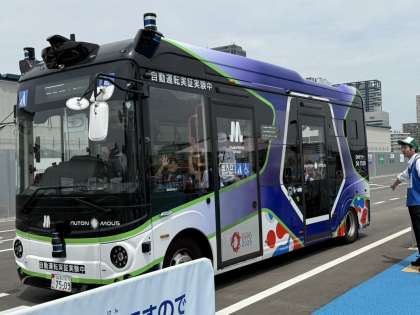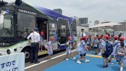 大阪・関西万博で走るEV・自動運転バスに乗りました。施設内のコースを走行中、大阪城が見えて、子ども達は大喜びでした。