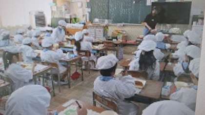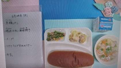 今日の献立は、鶏肉のカレー風味焼き、スープ、ツナと