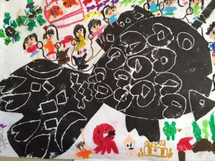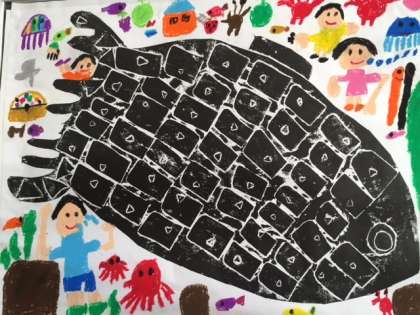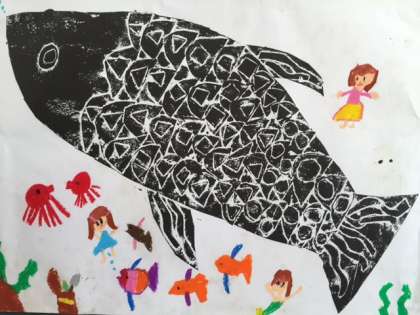 1年生の図工の紙版画が完成しました。各教室の後方にはたくさんの作品を掲示しています。水族館のようにいろいろな魚が泳いでいます。本日の参観日でご覧ください。