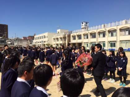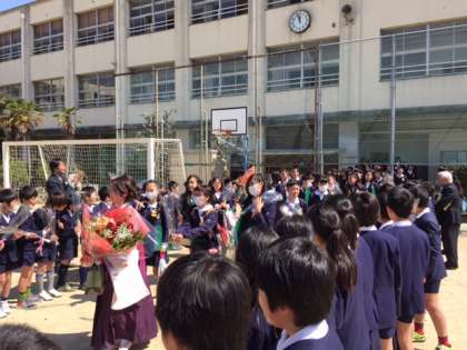 5年生・教職員・保護者・地域のみなさん全員で卒業をお祝いし、晴天の運動場で花束をプレゼントしました。