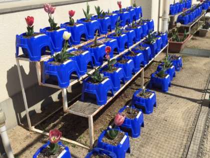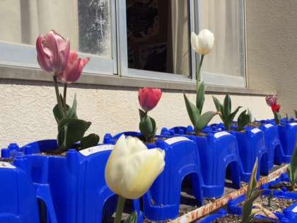 春の日ざし、1年生のチューリップが咲きはじめました。球根観察、毎朝の水やり、成長の記録など生活科の学習を通して、生物の成長を学びました。