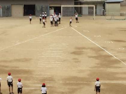 広い運動場で「ソフトボール投げ」や「50メートル走」などをしています。