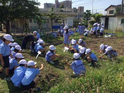 学習園で草抜きをしています。1年生はフウセンカズラを、2年生はサツマイモやナスを育てています。昨日の雨で草抜きがしやすくなっています。花や野菜を大きく育てるチャンスです。