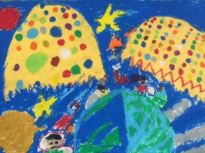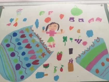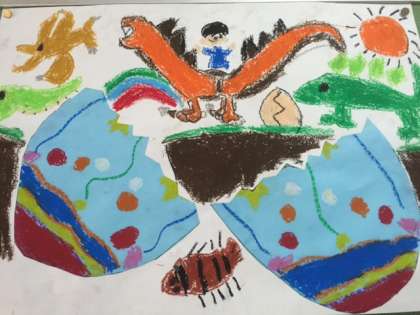 2年生の作品です。たまごがわれると子どもなりのいろいろな世界が飛び出し、ひろがっていきます。パスでしっかりと仕上げました。