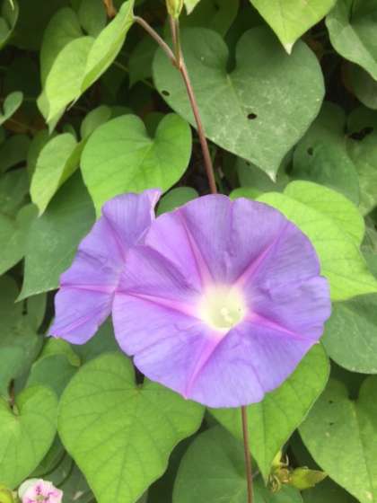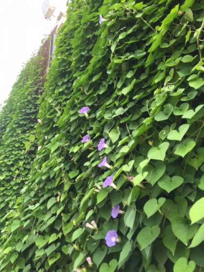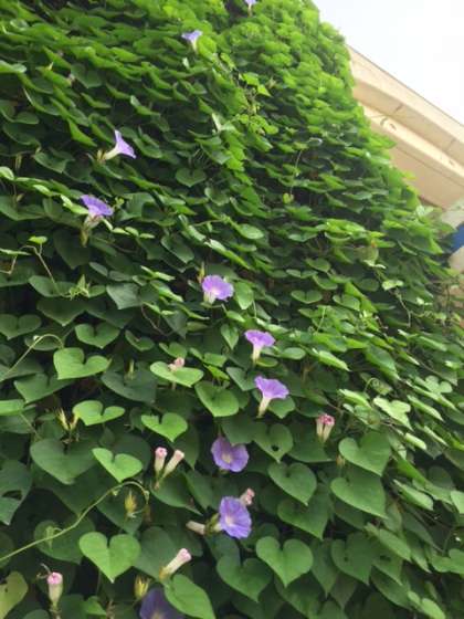 教室を直射日光から守るため、グリーンカーテンを5年前から育てています。生命力の強いリュウキュウアサガオがグングン育っています。