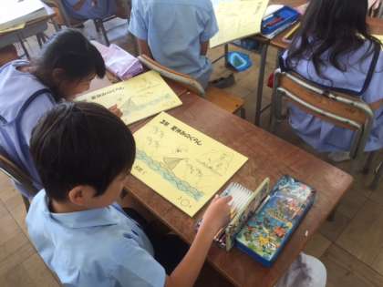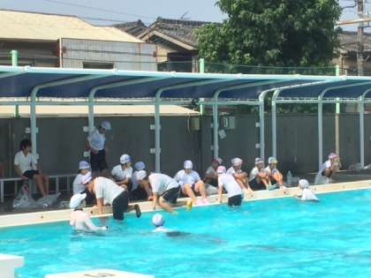 プールでは着衣泳をしています。万一の水難事故に備えて、ぬれた衣類の重さや動きにくさを体感しています。教室では夏休みの宿題冊紙を作っています。さて、いよいよ明日は「土曜授業・終業式」です。住之江警察暑の警察官から「安全な夏休みのすごし方(防犯・交通安全)」についてご指導をいただきます。保護者・地域の方々も多数ご参観ください。
