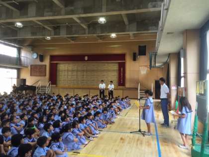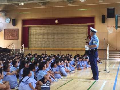 いよいよ夏休み。今朝は土曜授業で終業式をしました。「1学期をふりかえって」の作文発表がありました。住之江署の警察官から「安全な夏休みのすごし方(特にスマホ事故・交通事故・不審者事件)」についてお話をしていただきました。