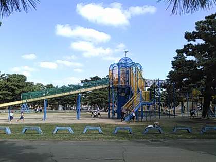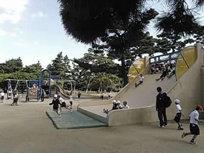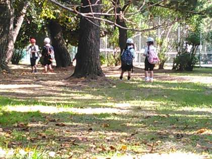 秋晴れの浜寺公園に来ています。オリエンテーリング・どんぐりさがし・すべり台遊びなどを楽しんでいます。