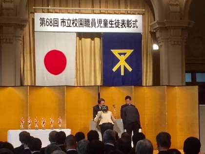 文化の日、中央公会堂で市立校園職員児童生徒表彰式がありました。本校の管理作業員さん2名に職務精励表彰がありました。毎日、安心安全・美化の学校づくりで児童を支えていただいています。