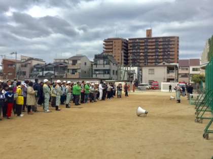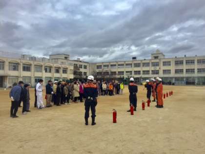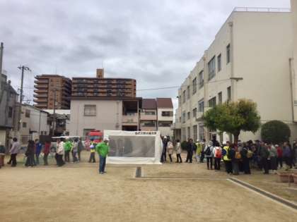 地域の避難訓練がありました。各町会からたくさんの人々が運動場に来られました。家の人と一緒に参加している子どもたちもいました。消防署や区役所の指導のもと煙テントや水消火器の体験をさせてもらいました。