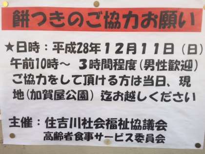 地域の掲示板に案内がありました。もうすぐ「もちつき大会」です。住吉川小学校の子どもたちも毎年、多数参加させていただいています。もちつきができるパワーのある人を募集しています。PTAや地域の一員として、子どもたちと一緒にもちつきをしませんか。保護者パワーを発揮して、積極的に参加してください。