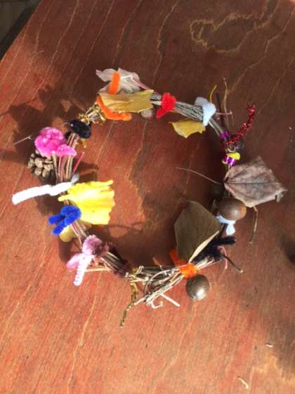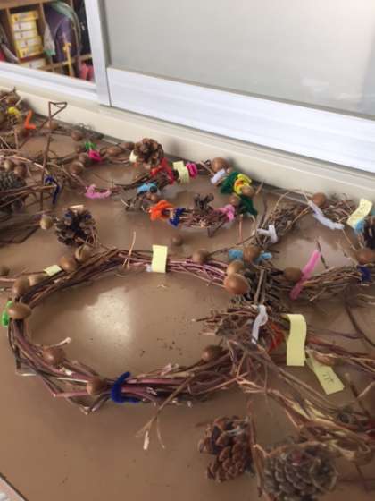 玄関掲示がサンタクロースになりました。1年生が生活科で集めてきたドングリやマツボックリなどでリースをつくっています。