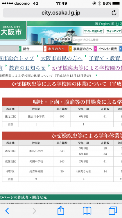 昨日6年2組で風邪・発熱・腹痛・嘔吐等の症状による欠席が8名(全41名中)ありました。校医さんと相談し、13日〜14日の2日間を学級休業としました。他学年に広がらないように、手洗い・うがいの徹底を指導しています。学級再開は12月15日(木)です。