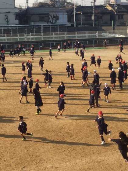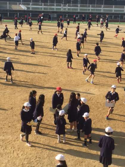 今朝のニコニコ集会(異学年活動)は「3色おにごっこ」です。500人の子どもたちが赤帽・白帽・帽子なしの3色チームに分かれて、おにごっこをします。スケールの大きなおにごっこを楽しむことができました。