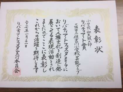 芸能クラブが和太鼓の演奏でリバティーアートフェスタに出場しました。日頃の練習の成果を発揮し、表彰状をもらってきました。。