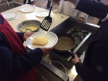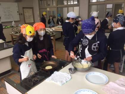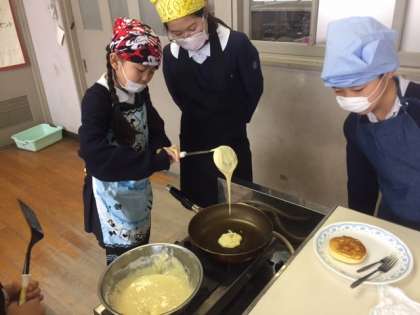 5年生が家庭科の調理実習でホットケーキをつくっています。ふっくらといい感じで仕上がっています。