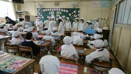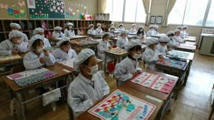 給食のエプロン・帽子・マスクを着けて、静かに待ちました。
