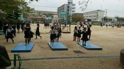 朝、登校してきた子ども達が、運動場にすぐに出てきて、職員室の前にあるジャンピングボードでぴょんぴょん跳びはじめます。