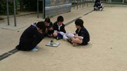 6年生が、運動場で理科の「ものの燃え方と空気」の実験をしていました。