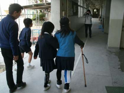 3〜4人のグループに分かれ、高齢者の体験、サポーターの体験をしました。足や腕にはおもりなど、目には見えにくくなるゴーグルをつけ、杖をつきながら階段の上り下りをしました。想像以上の体験にぎっくりした子どももたくさんいました。高齢者はこれに痛みも加わるということを教えてもらいました。相手を知り、共に生きていくためのよい経験となりました。