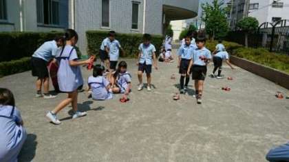 理科の時間に4年生の子ども達がソーラーカーを走らせていました。