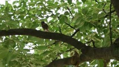 どうも桜の木の上のほうに巣をつくっていて、その中にヒナがいるようです。