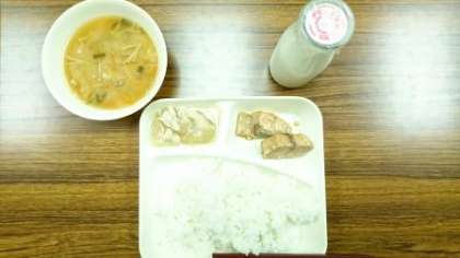 今日の給食は、さけのさんしょう風味焼き、みそ汁、とうがんの煮物、ごはん、牛乳でした。