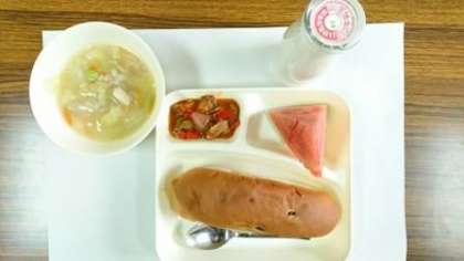 7月14日(金)の給食のメニューは、押し麦のスープ・夏野菜とベーコンのソテー・すいか・レーズンパン・牛乳でした。