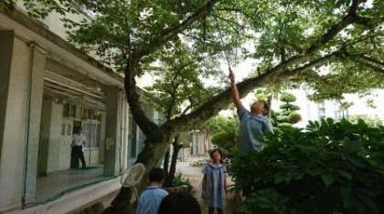 今日も職員室の前の桜の木の下に、何人もの子ども達が集まってきて、セミとりをしていました。