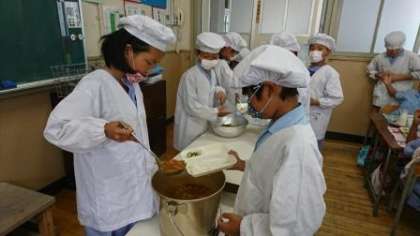 今日の給食のメニューは、チキンカレーライス(米粉)、きゅうりのピクルス、みかんゼリー、牛乳でした。