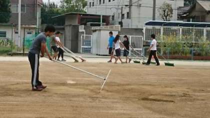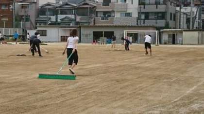 住吉川小学校の運動場は広いのでにがりを広げるのも大変です。