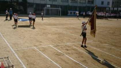 最初の入場行進は、ちょっと元気がなかったのですが、先生から指導を受けた後の2回目は、姿勢や歩き方に気をつけてずいぶんピシッとなりました。