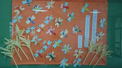 色とりどりのかわいい赤とんぼが、飛んでいます。