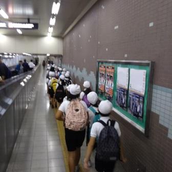 電車の乗り換え。狭い通路です。 2列にきちんと並んで歩いています。さすが3年生!