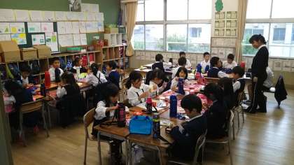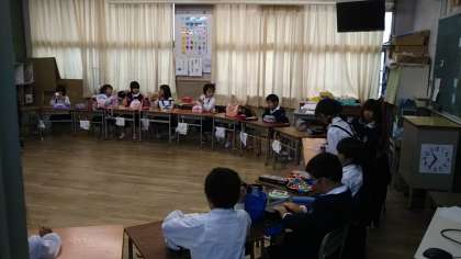 各クラス、グループになったり、学級全体で机をまるくしたりして、パクパクとおいしそうに食べていました。