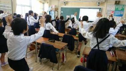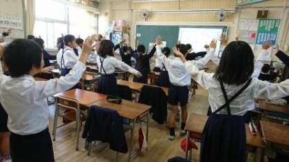 3年1組では、歌に合わせて、体を使って英語を楽しんでいました。