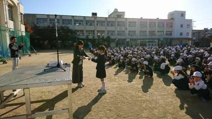 今日の児童朝会では、先週に引き続き、大阪市の大会で表彰された子どもを紹介しました。