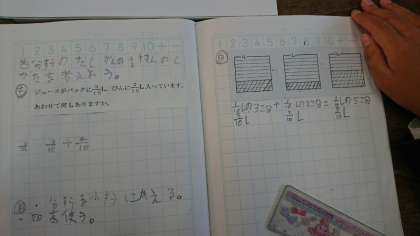 3−2の算数の「はしたの大きさの表し方を考えよう〜分数を使って」の学習を見てきました。