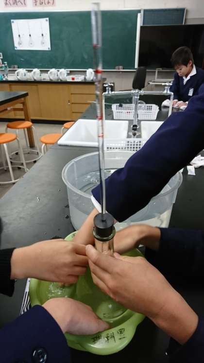 フラスコに水を入れ、そのフラスコをお湯で温めたたり、氷水で冷やしたりして、水のかさを比べていました。